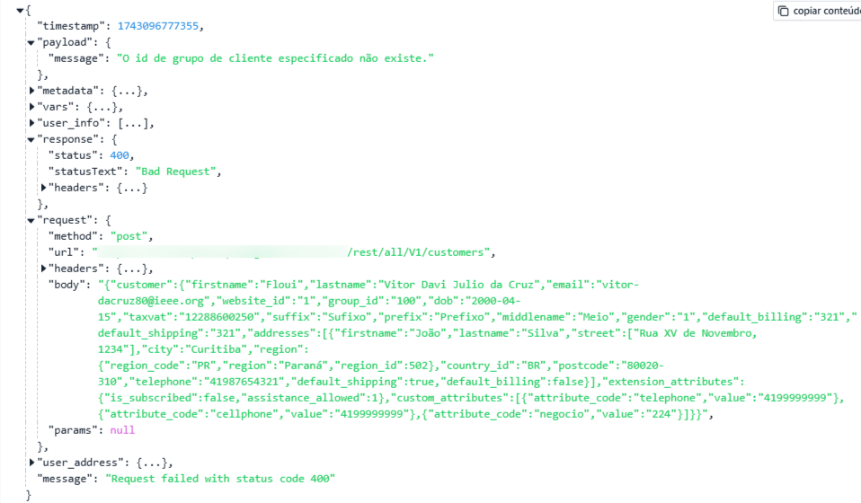 Quando a requisição for bem-sucedida, a resposta conterá todos os dados de cadastro do usuário, além do identificador único do seu cadastro no e-commerce.